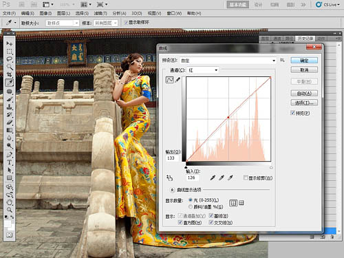 4、给选区中的面部执行一个曲线命令,利用曲线中的加红来改变色彩,如图所示。