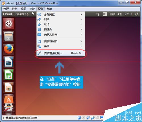 2、在”设备“下拉菜单中,点击”安装增强功能“按钮: