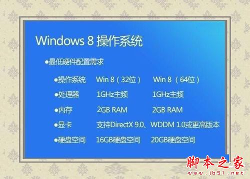 电脑:安装Win8操作系统,CPU需要在1GHz以上,内存空间2GB以上,显卡需要支持 DirectX 9和WDDM 10或更高版本。