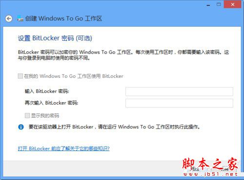 7、在“设置 Bitlocker 密码(可选)”中,如果希望使用 Bitlocker 来保护 Windows To Go 以防止未经授权的使用,那么可以在此步骤中键入 Bitlocker 密码,这样每次在 Windows To Go 启动时都会要求输入密码,否则无法使用。