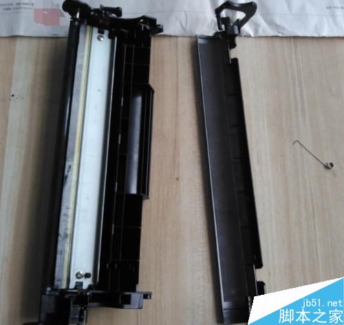 接下来将硒鼓两侧的两个销子取下来,硒鼓的两边就分开了,如图所示:
