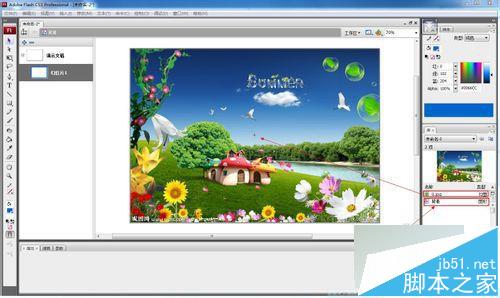 双击库中的图形元件“背景”,进入“背景”元件编辑状态,然后将导入到库中的背景图片拖入到当前窗口中,就完成了“背景”元件的修改操作。