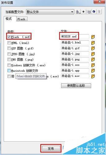 最后发布制作的幻灯片文档。选择“文件”-“发布设置”,打开“发布设置”对话框,勾选“Flash(*.,swf)”,输入要发布的文件名,最后点击“发布”按钮发布即可。