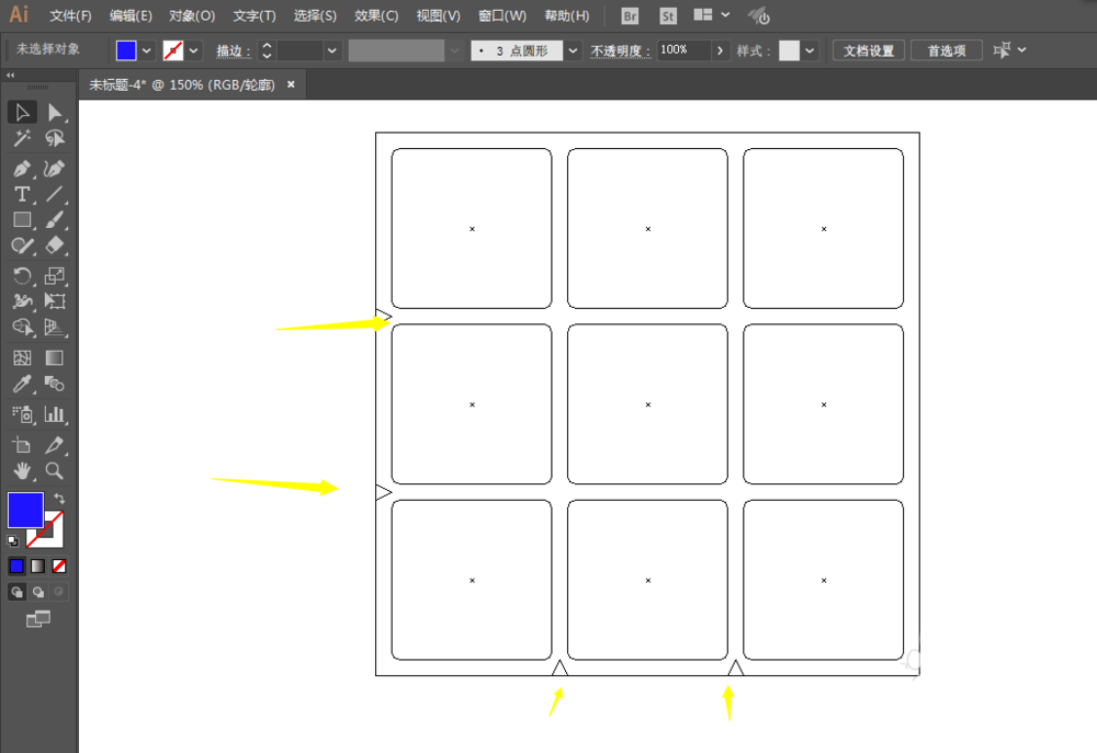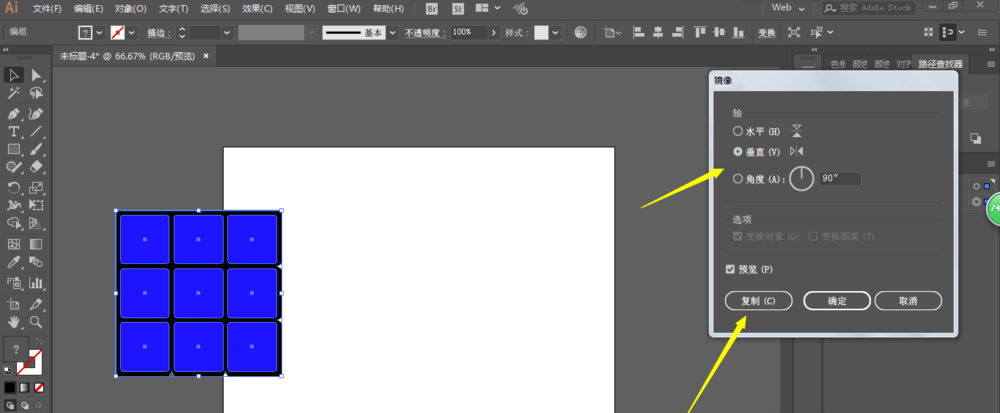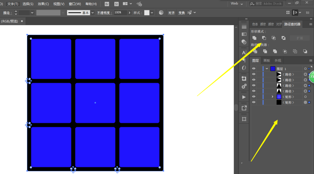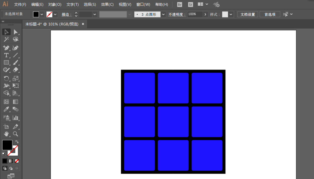 3、用变换效果移动复制两个,接着再复制6个,把9个圆角正方形移动到大正方形上。最后修改一下大方形的圆角。