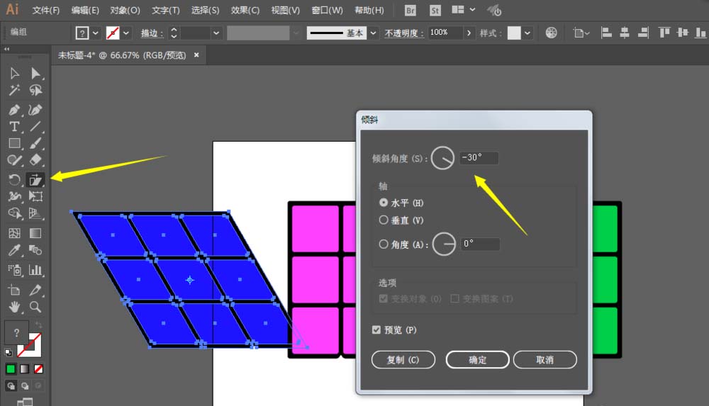6、如图对三个方块进行比例缩放,倾斜角度和旋转处理。