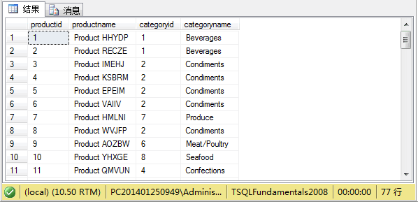 -- 设置数据库上下文 USE TSQLFundamentals2008; GO SELECT productid,productname,categoryid, CASE categoryid WHEN 1 THEN 'Beverages' WHEN 2 THEN 'Condiments' WHEN 3 THEN 'Dairy Products' WHEN 4 THEN 'Confections' WHEN 5 THEN 'Grains/Cereals' WHEN 6 THEN 'Meat/Poultry' WHEN 7 THEN 'Produce' WHEN 8 THEN 'Seafood' ELSE 'Unkown Category' END AS categoryname FROM Production.Products;