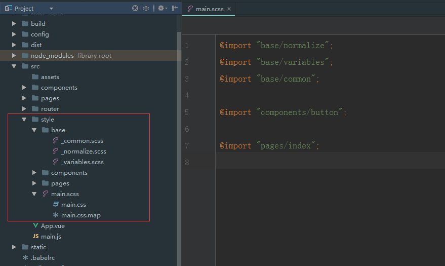 项目结构如上图,style文件夹下是分门别类的scss文件,方便管理和后期维护。然后在main.scss引入所有的scss样式片段,使用 sass --watch main.scss:main.css 命令监听并将scss文件编译为css文件。最后在main.js中引入main.css文件。这样你就可以直接在元素上添加class,然后在scss中畅快写样式了。