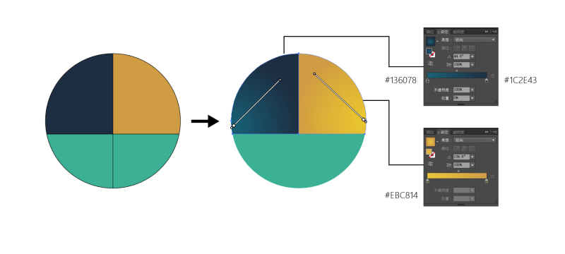 一个正圆打底, 填充:#35b094。原地复制粘贴两份(Ctrl+C - Ctrl+F ),使用选择工具(V),选择其中一个正圆调整好位置大小, 选择对象使用路径查找器(Shift+Ctrl+F7)将基本形的暗部做出来,加上渐变,最后复制粘贴,调整位置即可。