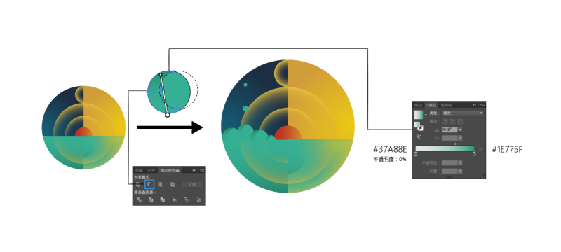 温馨提示:这里的三个正半圆, 也是使用路径查找器(Shift+Ctrl+F7)做的,先做好靠近太阳的一块, 先调整好渐变。然后原地复制粘贴一份(Ctrl+C - Ctrl+F ),使用选择工具(V),按住(Shift)等比例放大做出第二层。最后一块则是用选择工具(V)复制、翻转+对齐就可以了,同时记得对齐锚点和中心线。