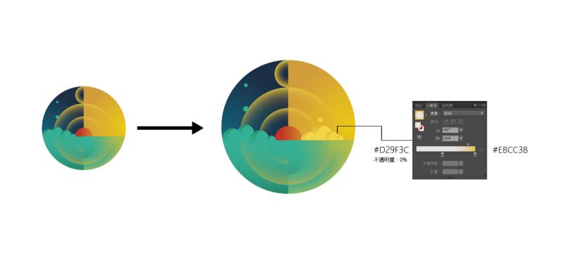 太阳同向渐变:径向 - 90° - #D29F3C (不透明:0%) ~#EBCC3B太阳向左渐变:径向 - -180° - #BF3524(不透明:0%)~#D28B2D因为辐射的范围不同,所以左侧色值的位置也要有相应的调整,状态如下图: