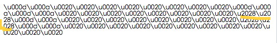 查看出现问题页面的网页源代码,复制空白换行部分转码为Unicode编码,发现其中包含了\u2028这样的字符【图一】。
