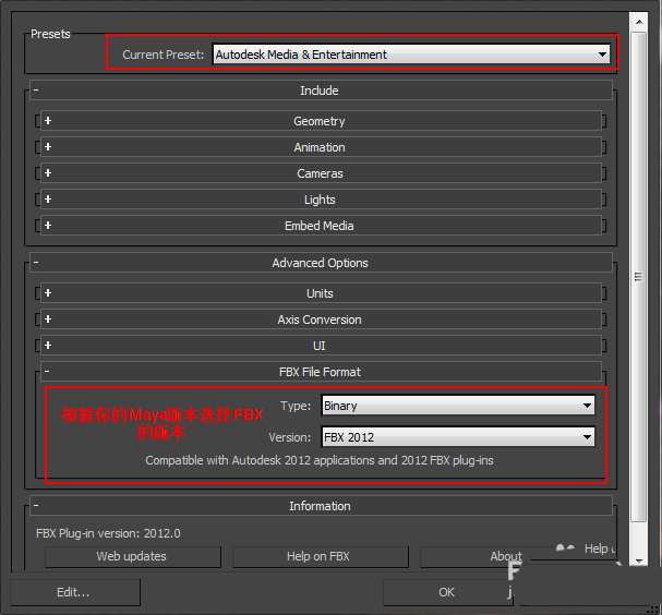 3、FBX格式的设置见下图。