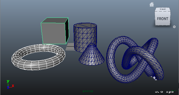 7、导入到Maya,可以看到有三个模型确实是被转换成了三角面,另外两个保持了四边面见下图。