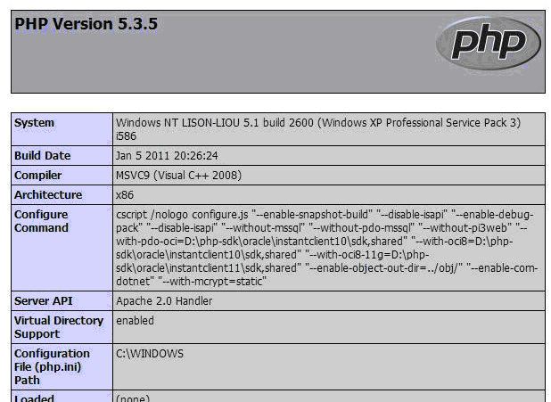 保存退出,此时apache+mysql+php5的运行环境就搭建完毕,你可以在测试目录中新建一个文件phpinfo.php,其中写入:<?php phpinfo(); ?>,然后通过http://localhost:8080/phpinfo.php进行访问。如果成功的话,将出现如下图的页面: