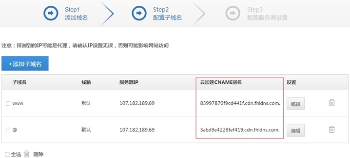 这里我们设置解析的IP,如果我们的域名已经有解析,会自动检索进来。最后我们需要在域名解析面板设置@和www的别名CNAME解析,对应百度云加速给予的两个地址。