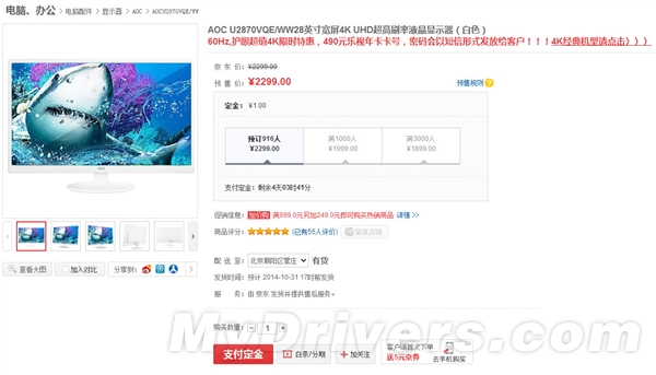 京东上目前出现了一款非常超值的4K显示器,其型号为AOC U2870VQE/WW28,尺寸为27英寸,面板材质应该是TN,提供了一个VGA、两个HDMI以及一个DP接口。其售价只有2299元,如果在11月1日之前,参与预订的人数满1000人,售价将会降低到1999元;如果满3000人的话,售价还能进一步降低到1899元。目前预订人数已经达到了918人,四天内突破1000人问题不大。