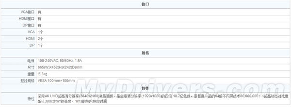 此外该显示器的亮度为300cd/m²,响应时间为1ms,可视角度为170/160度,动态对比度为80000000:1,还内置有音箱。