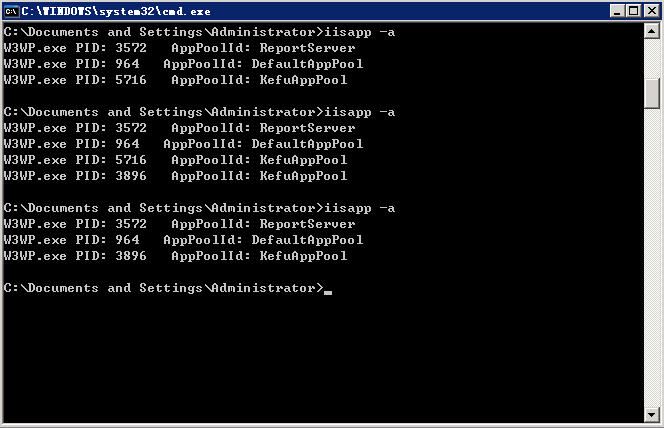 2)在命令提示符下运行iisapp -a。注意,第一次运行,会提示没有js支持,点击确定。然后再次运行就可以了。这样就可以看到pid对应的应用程序池。如上图左侧所示,应用程序池 KefuAppPool和PID=3232的w3wp.exe相关联,应用程序池ReportServer和PID=3572的w3wp.exe相关联.
