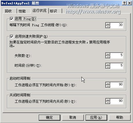 启用Ping:默认情况下应用程序池配置为每隔30秒Ping工作进程,当工作进程没有进行响应时,则认为此工作进程出现故障并默认配置为关闭此工作进程。你可以修改Ping的时间间隔,但是太长的Ping间隔可能会导致Web服务的中断,而太短的Ping间隔又会消耗更多的系统资源和CPU利用率,因此建议你保留默认配置;