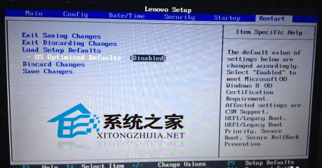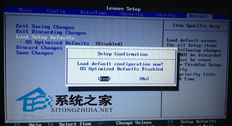 2. 进入BIOS设置界面后,按方向键菜单移动至“Restart“,然后在按方向键到” OS Optimized Defaults“选项,按下“回车”键打开该选项的设置菜单,将该选项默认的”Enabled“修改为”Disabled“之后, 按下“回车”键确认。再按方向键选择”Load Setup Defaults“选项,按下回车键启动恢复BIOS默认功能窗口,在该窗口直接按下笔记本键盘上的”回车“键启动BIOS恢复默认功能。之后再按下笔记 本键盘上“F10”键启动BIOS保存设置窗口,在该窗口中直接按下笔记本键盘上的”回车“键启动BIOS保存设置并重新启动计算机功能;