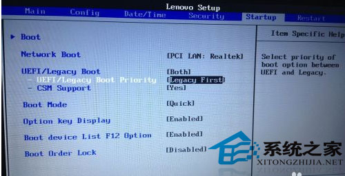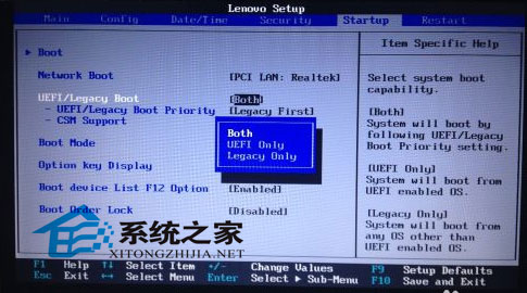 4. 按下键盘上“→”按键选择到”Startup “选项,按下键盘上“↓”按键选择到”UEFI/Legacy Boot “选项按下“回车”键打开该选项的设置菜单,按下键盘上“↓”按键并将该选项默认的”Both“修改为”UEFI Only“之后按下“回车”键确认。再按下笔记本键盘上“F10”键启动BIOS保存设置窗口,在该窗口中直接按下笔记本键盘上的”回车“键启动BIOS 保存设置并诚信启动计算机功能;