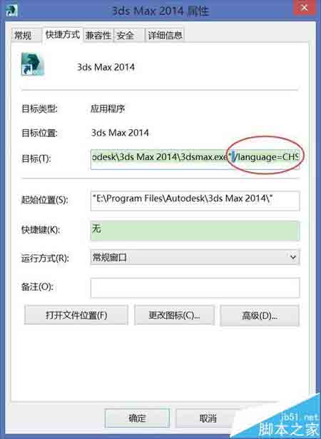 3、第二部进入属性面板,在目标框的后面,加一个空格后,斜杠/,输入language=CHS,点确定后退出!如下图示!再打开3DMAX看看吧!简体中文是不是出来了?