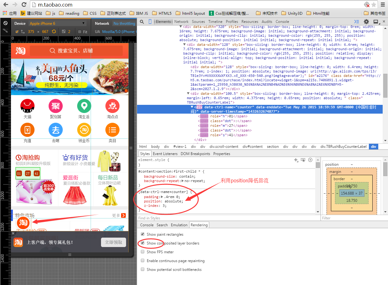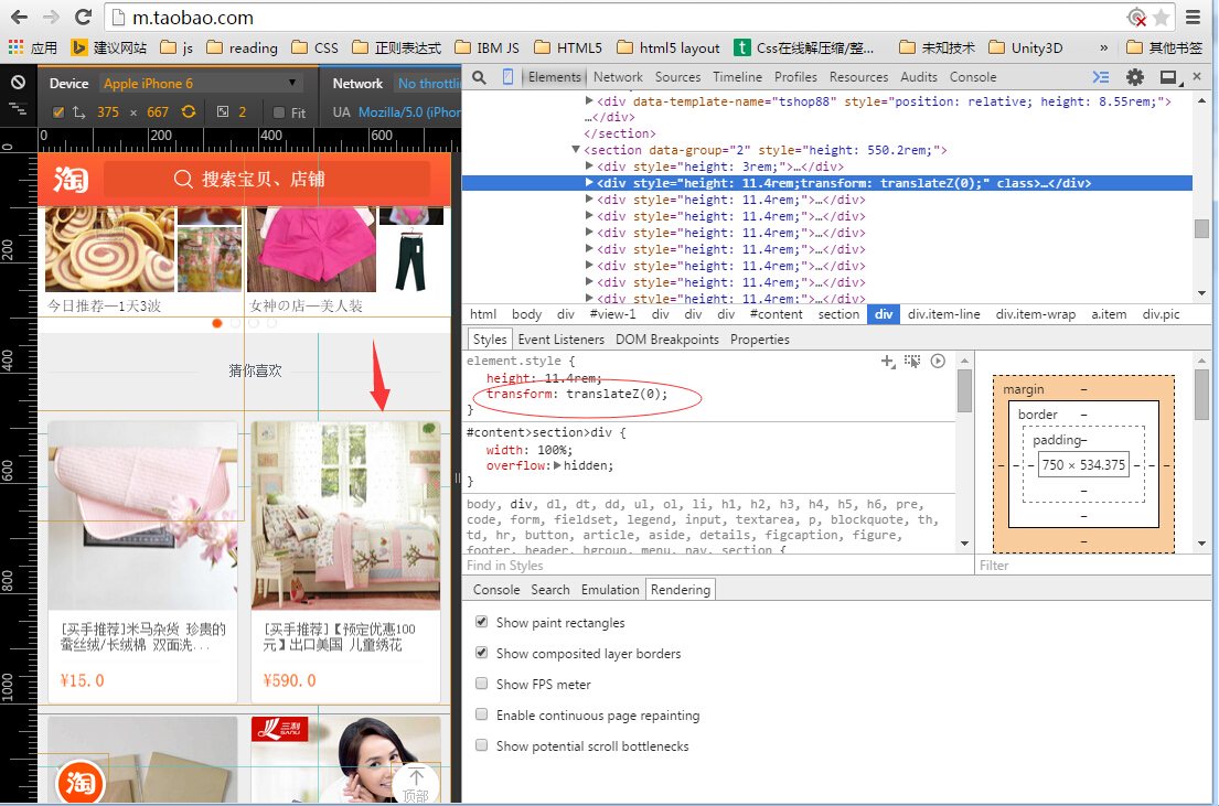 看上去挺多挺复杂的,其实最简单、最容易理解、也最容易滥用的是第一条。实现第一条仅需要在元素的样式里加上。transform:translateZ(0);-webkit-transform:translateZ(0); 就可以了。我们将淘宝往下滑动一点,找一个元素试试看。
