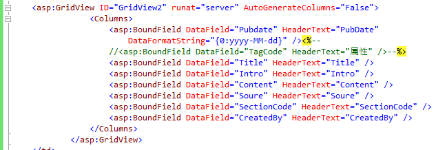 第一步:设置好你所需要的gridview所需要的Columns列,绑定好数据,我的第一列的数据因为数据库中保存的是“日月年时分秒”的格式,在输出的时候,我给它加了一个dataformatstring的值“{0:yyyy-MM-dd}”,年月日的格式,这样输出来的时间格式就是2016-08-07,看起来也美观一些