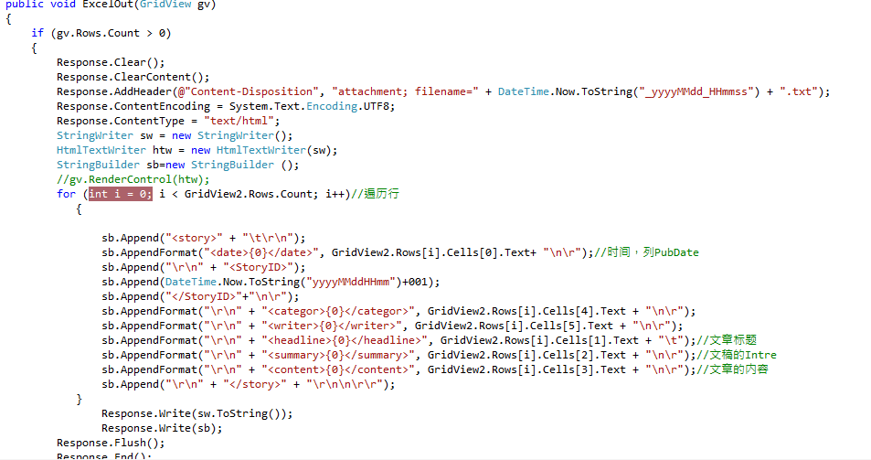 除去for循环部分,其余的根据我这样写就可以了,我这个是加节点的文件输出,如果你只是想把你grdview所显示的所有数据输出输出的话,你就直接写循环你gridview数据源的代码就好,再加个循环j的,我这里所采用的stringBuilder,数据拼接,一个一个显示我所需要的列