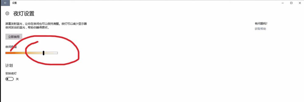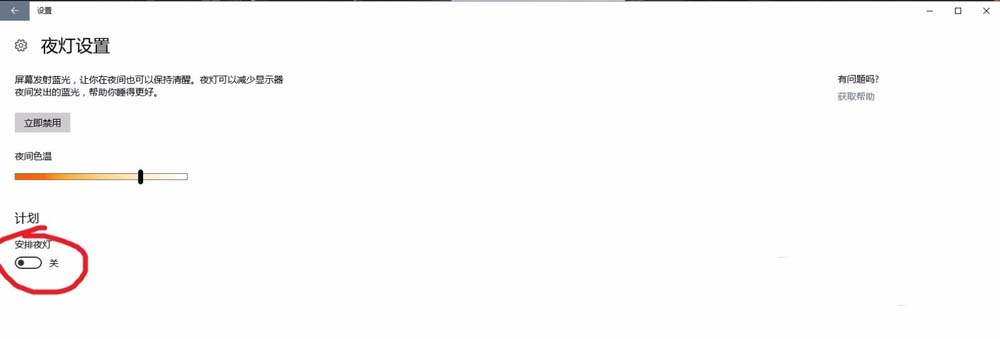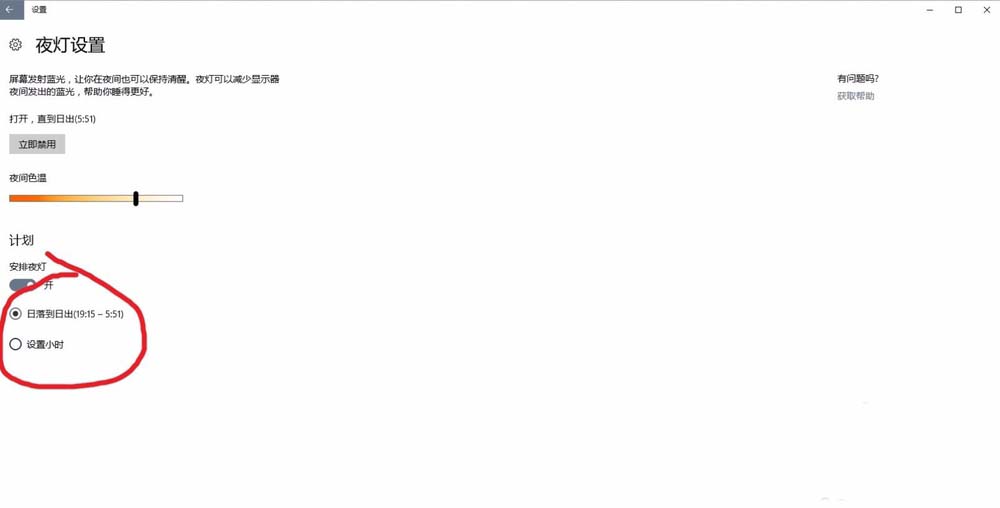 8、打开之后他又一个默认选项,默认是晚上开暖色调,这样可以尽可能的保护自己的眼睛,说起来微软还是比较贴心的,