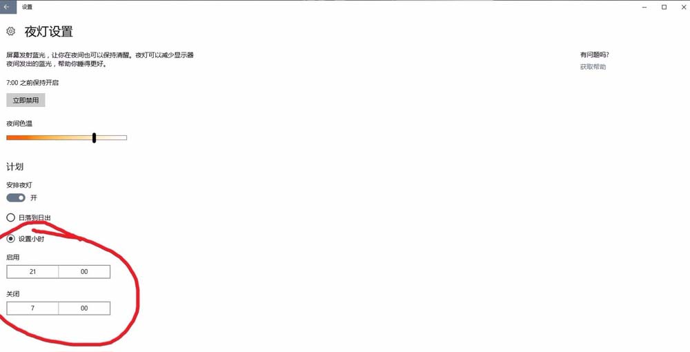 9、不过每个人的工作使用环境都不一样,我们可以选择下面的设置小时,设置自己想要的时间段,不过小编是一直开的,虽然颜色黄点,但是对眼睛好啊,除非在处理图片或者需要进行色彩还原的时候才把它关掉,总之希望大家GET到这个小设置,对自己的眼睛好点就行了。