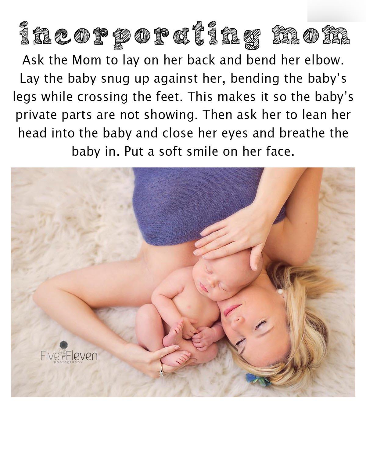 让妈妈平躺下并将胳膊肘弯曲。让宝宝舒服的平躺下背对着她,双脚交叉蜷起宝宝的腿。这样可以保护宝宝的私处不被显示出来。然后让妈妈倾斜着头靠近宝宝的头,闭上眼睛用呼吸把宝宝带入状态,在脸上露出温柔的微笑。
