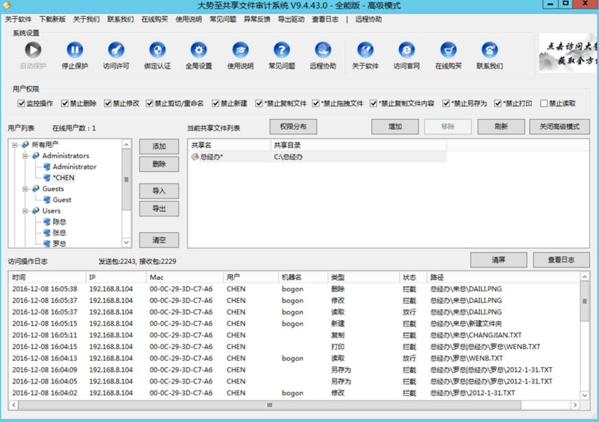 | 大势至文件共享管理软件(下载) | 是一款专门的共享文件夹访问日志记录软件、服务器共享文件访问权限设置软件,可以实现只让读取共享文件而禁止复制共享文件、只让打开共享文件而禁止另存为本地和禁止拖拽共享文件以及只让修改共享文件而禁止删除共享文件,保护服务器共享文件安全,防止共享文件越权访问。 |