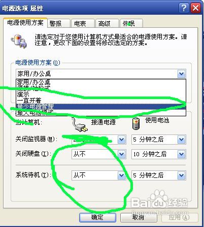 将电源管理的电源使用方案选择最少电源管理。而关闭监视器和待机的那几个选项都选择从不。