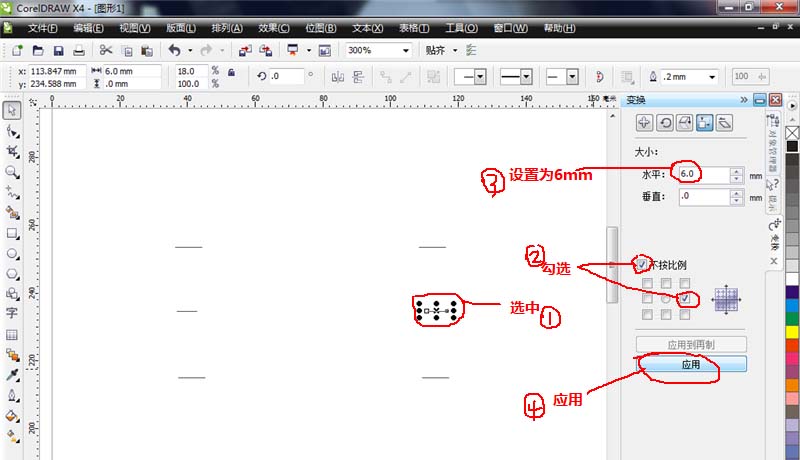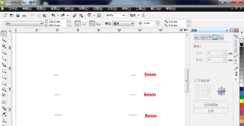 2、选中两条线段,复制两次。将【变换】工具组切换到【大小】,按住Ctrl键,选中其中一组的左侧线段,用【大小】工具,勾选【不按比例】,锁定左端,将其长度改为6mm;再选中其右端线段,锁定右端,同样将其长度改为6mm。再用相同方法,将另一组的两条线段长度改为5mm。