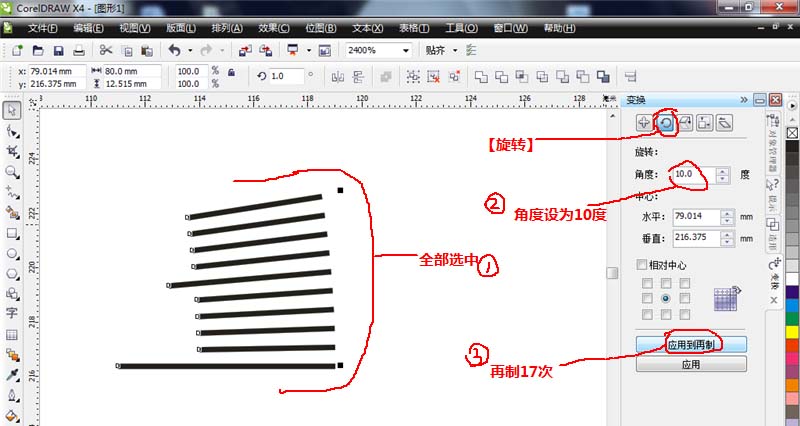 3、将线段为5mm的那组旋转1度,线段为6mm的那组旋转5度,线段为8mm的那组保持不变。全部选中,用【对齐与分布】将其水平居中、垂直居中对齐(或直接按快捷键C和E键)。
