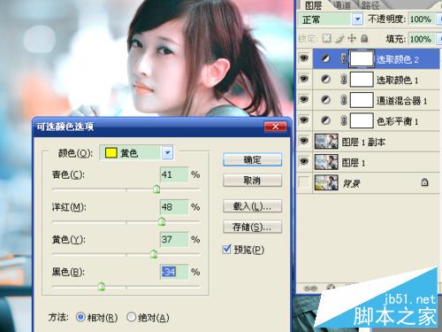 7、再选择“可选颜色”,黄色颜色选项中黑色数值减小,其它颜色增大。