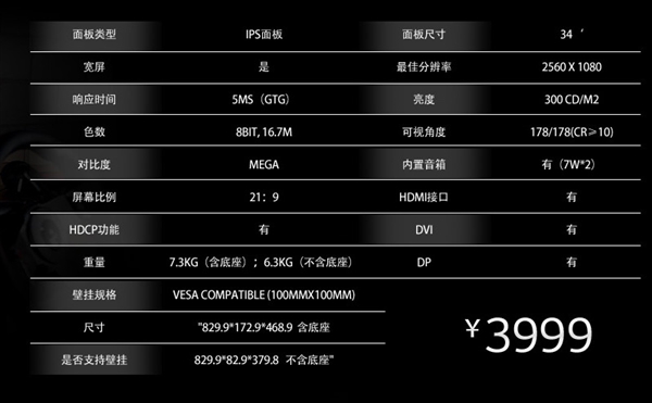 34UM67采用34寸、2560x1080分辨率的IPS面板,亮度300cd/m2,对比度1000:1,响应时间5ms,刷新率75Hz,色域sRGB 99%,重量为7.3kg(含底座),6.3kg(不含底座)。接口方面,提供DP、HDMI以及DVI。