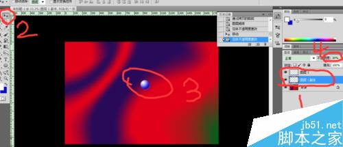 再次选择工具箱上的渐变工具,选择圆形渐变工具,设置前景色和背景色分别为白色和蓝色,然后在小球内拖拽,实现渐变,做出球状效果,按“Ctrl+D”取消选区,示意图如下。