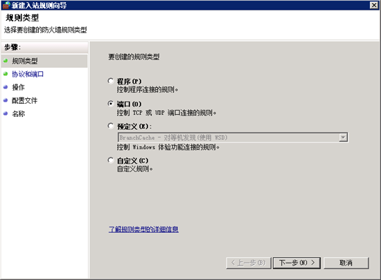 接着上面的步骤,打开系统自带的Windows防火墙,进入高级设置,进入“入站规则”,点击“新建规则”,规则类型选择“端口”,