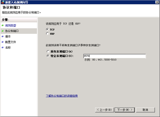 下一步,选择"TCP",指定端口处填上面在注册表里的修改好的端器,我这里是8579,