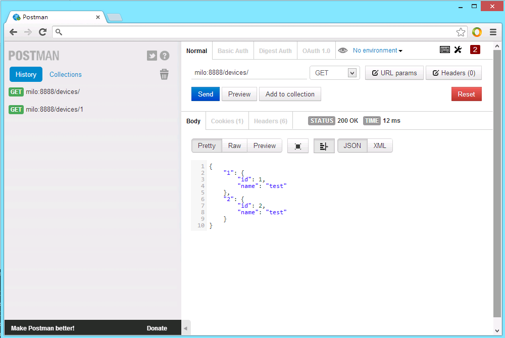 用Postman测试ok, 代码中唯一让人诧异的应该是delete map[req.param('id')],我们知道js的map是一个Object,或者Object是一个map,,delete object.property,可以删除这个属性,但是delete Object[Property]也可以把这个属性给干掉,delete o.x 也可以写作 delete o["x"],两者效果相同 关于delete请观看:ECMAScript delete!