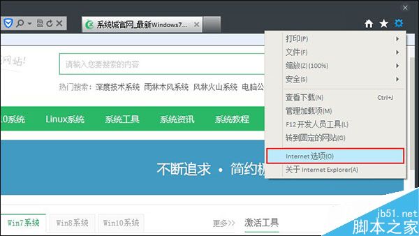 1、首先在windows7系统下打开浏览器,然后点击工具菜单中的Internet选项;