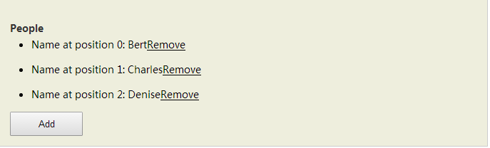 <h4>People</h4> <ul data-bind="foreach: people"> <li> Name at position <span data-bind="text: $index"> </span>: <span data-bind="text: name"> </span> <a href="#" data-bind="click: $parent.removePerson">Remove</a> </li> </ul> <button data-bind="click: addPerson">Add</button>