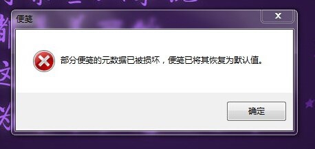 如图 每次一 开 机 就提示便笺元数据损坏,便笺已将其恢复为默认值,点击关闭后。就会 弹出第二张。点关闭后虽然不影响使用,但每次开机都出现还是很影响心情的,如果重装系统的确可能会解决这一问题,但可能还会出现,本人使用win7 322位和 64位系统均出现这个问题,如果不使用便笺,我们完全可以删除它,但是单纯的删除程序并不能解决问题,可以换win8系统,如果不喜欢win8可以用下面的方法来解决。