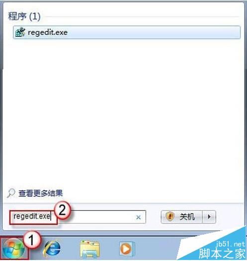 1、进入Windows7系统后,打开开始菜单,在开始搜索框中,键入“regedit.exe”,回车打开Win7系统注册表编辑器。