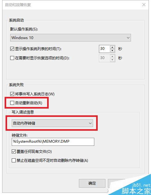 在“系统失败”中取消勾选“自动重新启动”,在“写入调试信息”中选择“自动内存转储”(默认),点击“确定”,第一项设置算是完成了。