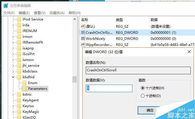 找好了位置之后,在右侧用鼠标右键新建DWORD(32位)值并命名为”名为”CrashOnCtrlScroll“,然后将数值修从默认的”0“修改成”1“。