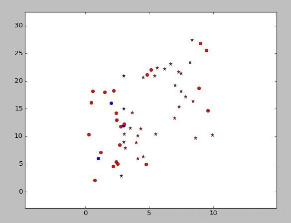图中蓝色是训练数据,红色是测试数据,圈圈代表类型[1,0],星星代表类型[0,1]。