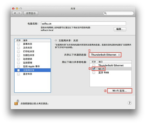 2,将“共享以下来源的连接”设置为你当前的上网方式(比如当前是PPPoE就选PPPoE,当前是以太网就选以太网,当前是Thunderbolt Ethernet就选Thunderbolt Ethernet),在“用以下端口共享给电脑”中选中“Wi-Fi”,这里的意思就是将上面的上网方式用下面的共享方式共享出去,一个是选来源,一个是选出口。如果你要设置Wi-Fi密码,请点击下方的“Wi-Fi选项”,可以设置网络名称、频段、安全性,网络名称默认就是你的电脑名称,频段保持默认即可,安全性就是密码,你可以选择“WPA2个人级”,然后输入密码,确认即可。